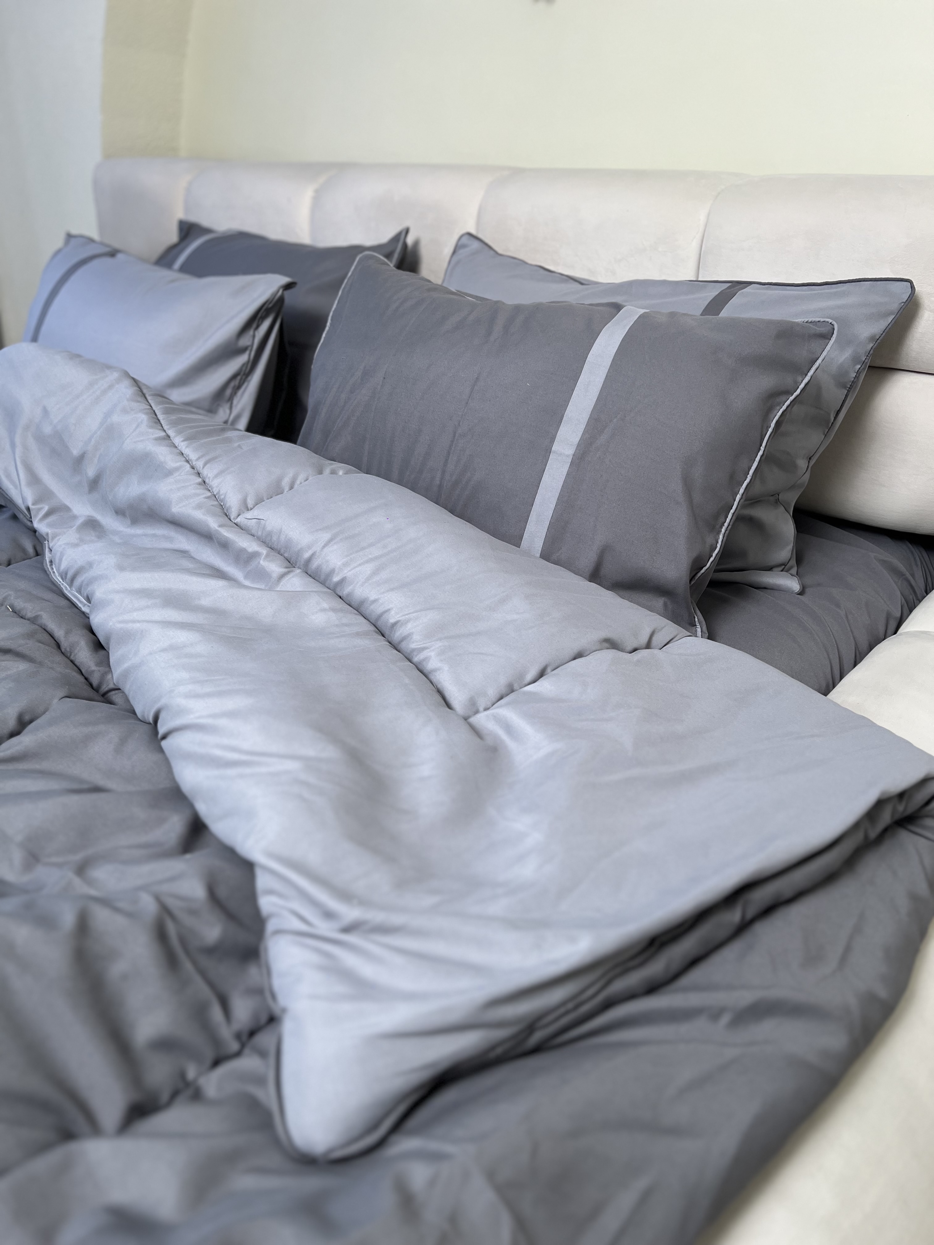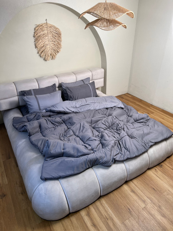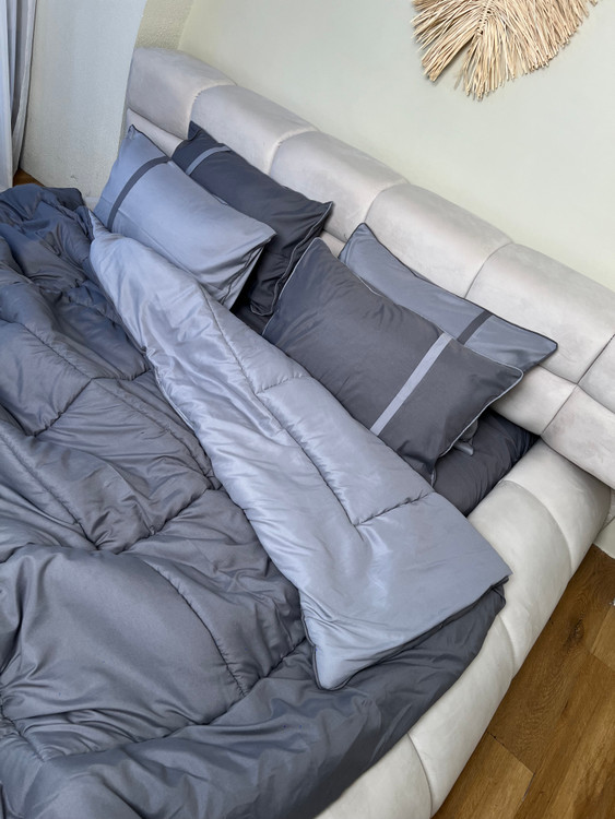 • ست دونفره ۶تکه : ۲ عدد روبالشی طوسی روشن ، ۲ عدد روبالشی طوسی تیره + یک عدد لحاف دورویه + ملحفه کشدار مناسب تخت دونفره