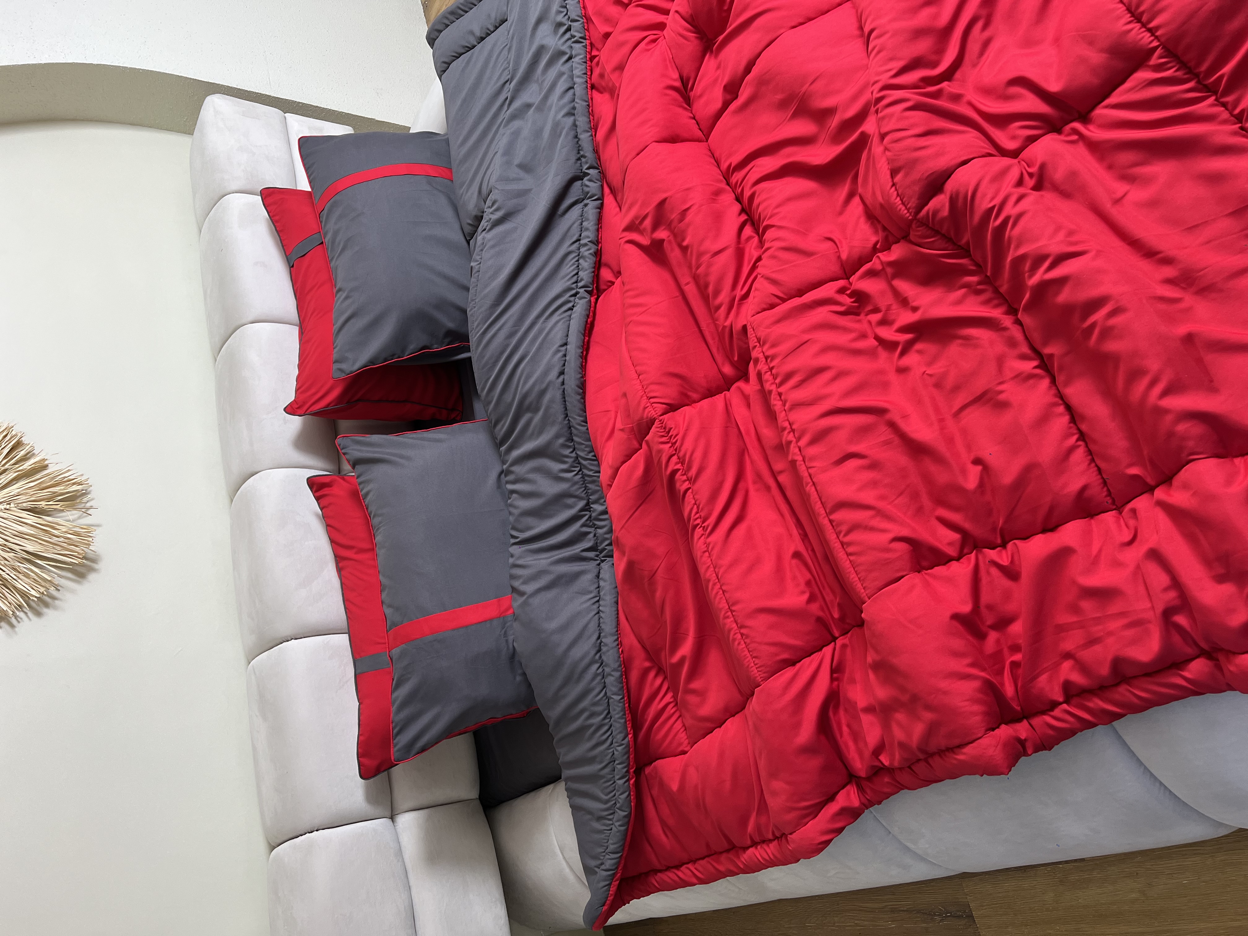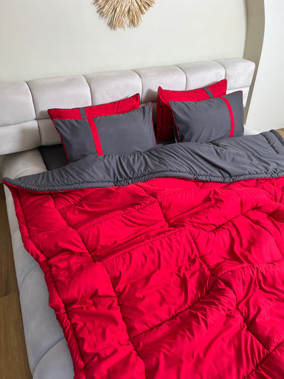 • ست دونفره ۶تکه : ۲ عدد روبالشی قرمز ، ۲ عدد روبالشی طوسی + یک عدد لحاف دورویه + ملحفه کشدار مناسب تخت دونفره