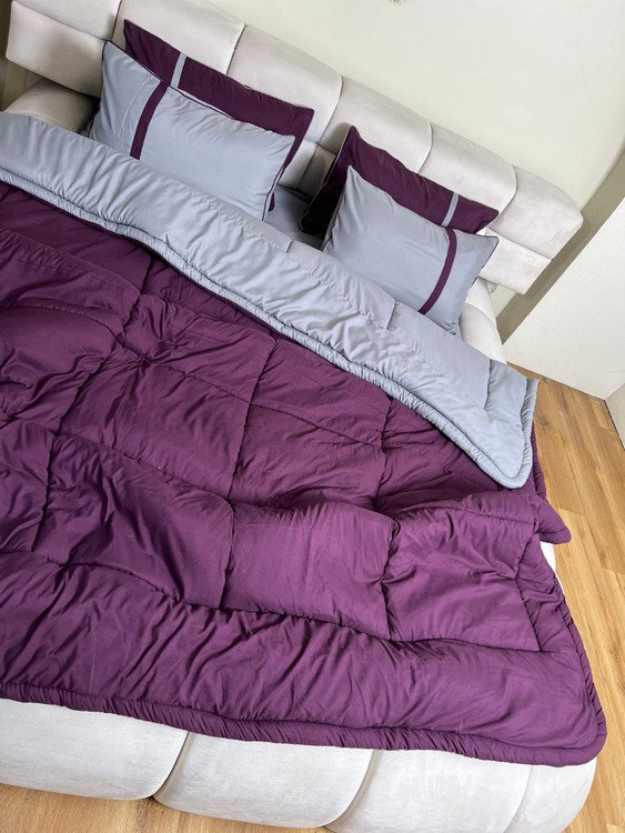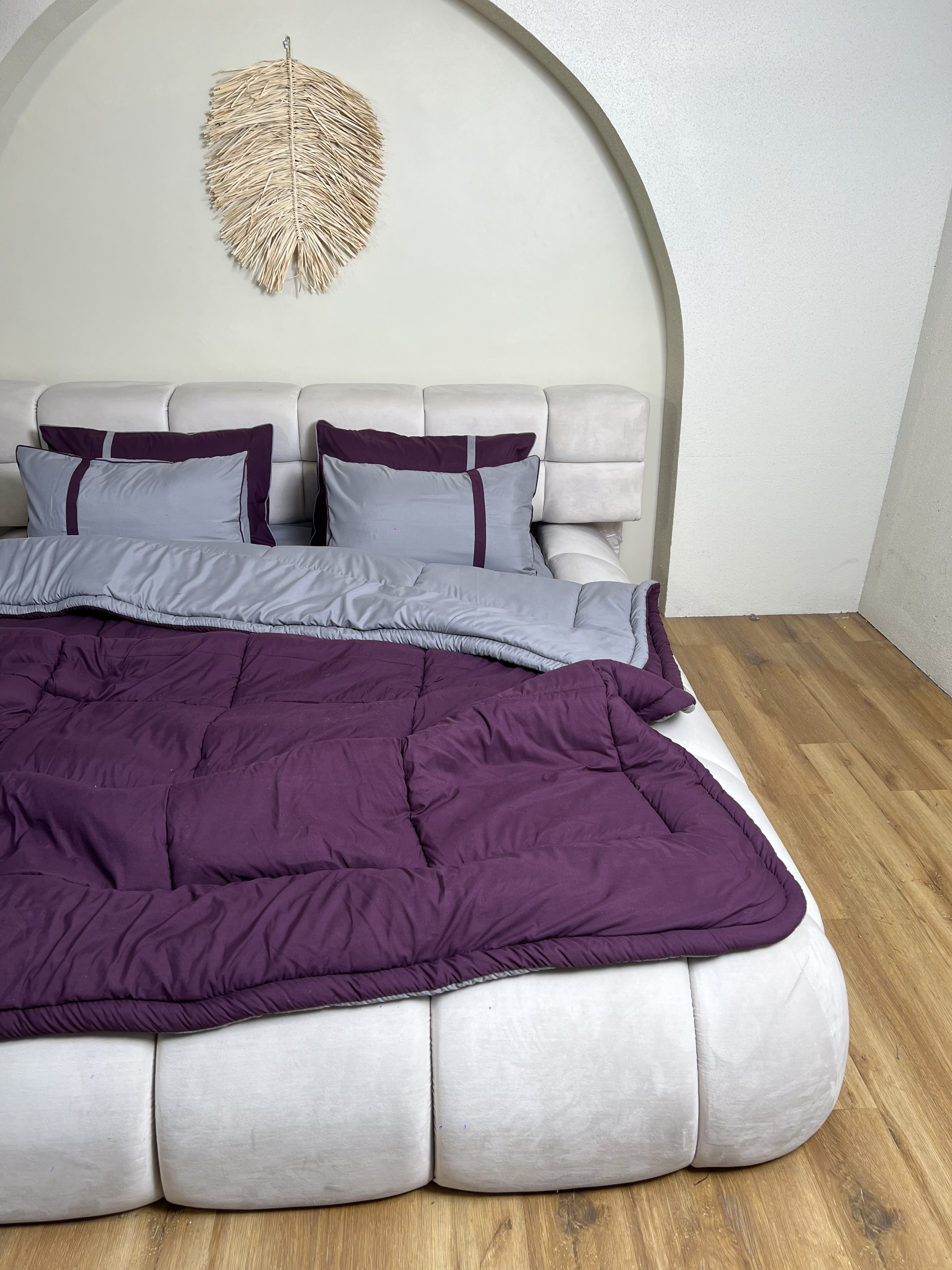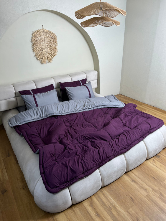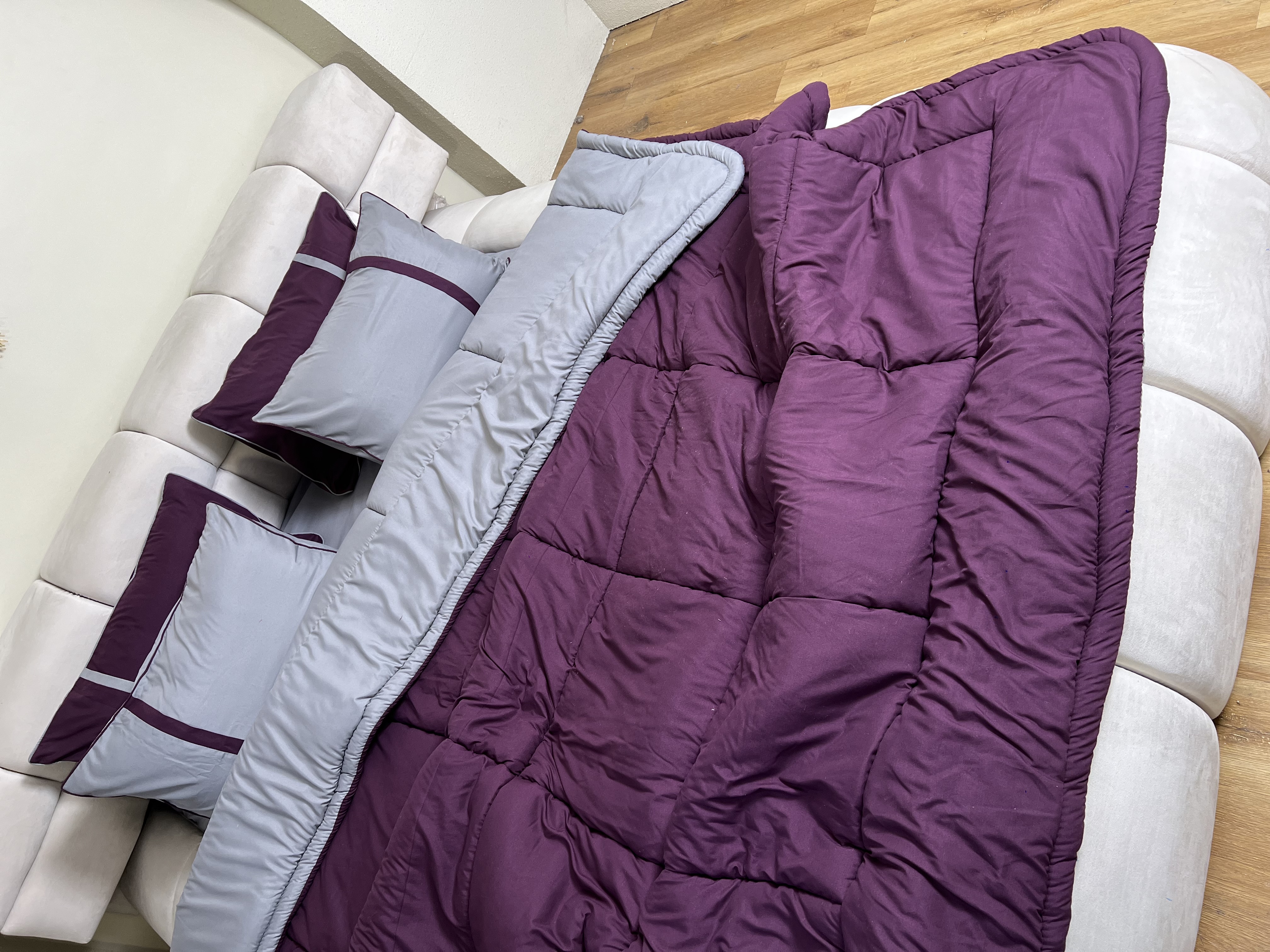 • ست دونفره ۶تکه : ۲ عدد روبالشی طوسی ، ۲ عدد روبالشی بنفش + یک عدد لحاف دورویه + ملحفه کشدار مناسب تخت دونفره